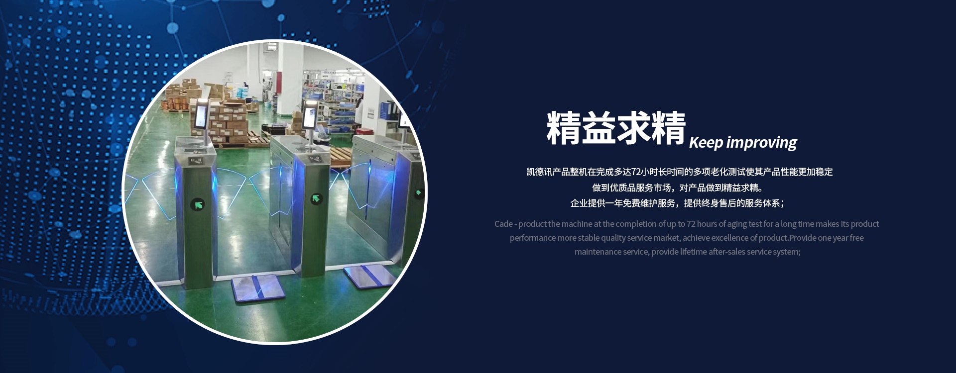 深圳市凱德訊科技有限公司成立于2003年,注冊(cè)資本500萬(wàn)元,位于港珠澳大灣區(qū)的深圳市,公司集研發(fā)、生產(chǎn)、銷售電子行業(yè)防靜電門禁系統(tǒng)和民用智能通道系統(tǒng)的綜合性企業(yè)。公司擁有自主產(chǎn)權(quán)的產(chǎn)品并一直致力于ESD門禁系統(tǒng)、智能安防門禁系統(tǒng)、景區(qū)通道閘機(jī)、人臉識(shí)別閘機(jī)、消費(fèi)系統(tǒng)、智能翼閘的研發(fā)生產(chǎn)與銷售。凱德訊目前擁有多款功能齊全的系統(tǒng)軟件及多款硬件產(chǎn)品,包含成型加工、機(jī)芯研發(fā)、軟件開發(fā)等技術(shù)均為本公司自主研發(fā)、獨(dú)立完成。14年來(lái),凱德訊一直秉承以用戶需求為核心,穩(wěn)定、實(shí)用、智能的產(chǎn)品是我們開拓市場(chǎng)的基石,務(wù)實(shí)進(jìn)取的精神是我們孜孜不倦的追求,全方位真誠(chéng)的服務(wù)是我們對(duì)您永恒的承諾。